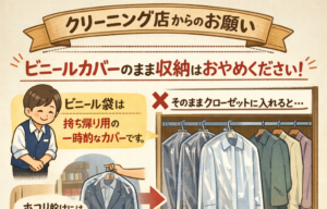 仕上がった衣類にかかっているビニール袋は、あくまで「お渡しまでの一時的な保護」を目的としたものです。店舗からご自宅までの移動中にホコリや汚れが付着するのを防ぐ役割であり、長期保管を想定して作られていません。ビニールは通気 […]
