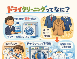ドライクリーニングは、家庭で行う水洗いとは異なる洗い方です。水の代わりに「溶剤(ようざい)」と呼ばれる専用の液体を使って衣服を洗います。この溶剤は水よりも繊維にやさしく、スーツやコート、制服など、水で洗うと縮んだり形が崩 […]