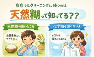 当店でクリーニングに使っている糊は、天然糊と呼ばれるものです。天然糊は、でんぷんなど自然の材料から作られており、昔から衣類の仕上げに使われてきました。天然糊のいちばんの良さは、衣類や肌にやさしいことです。自然由来のため刺 […]