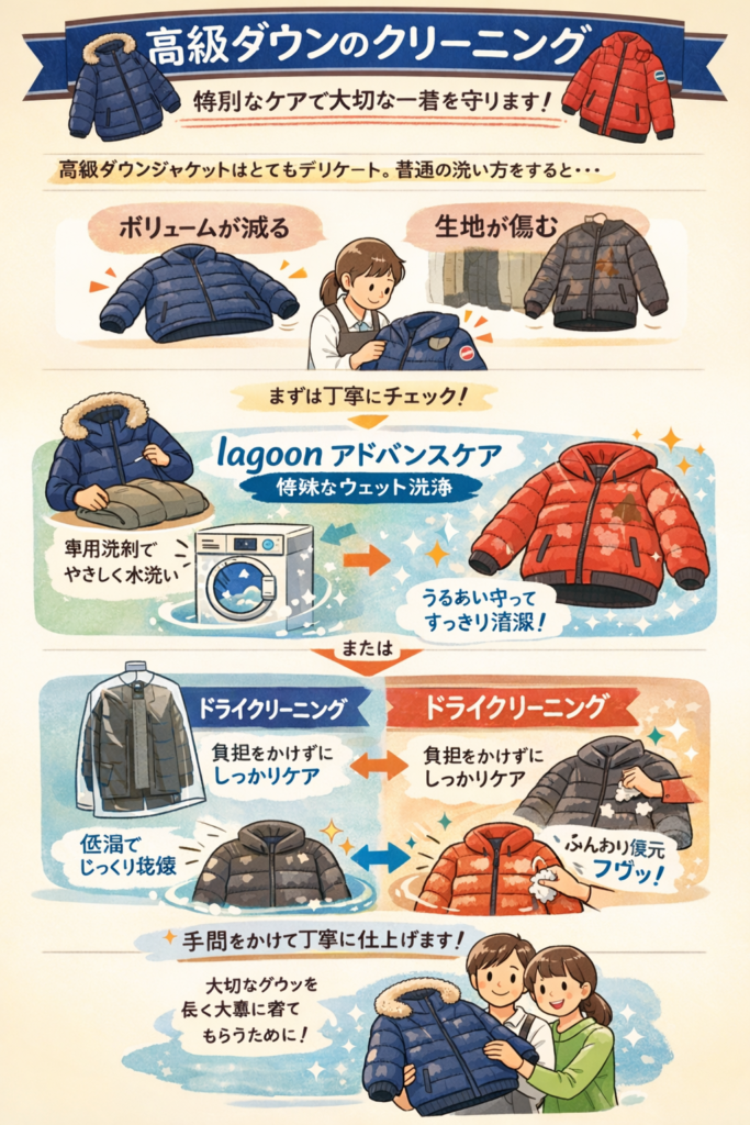 当店では、まず一着一着の状態をていねいに確認し、そのお洋服にいちばん合った方法を選んでお手入れしています。その一つが、lagoonアドバンスケアという特別なウェット洗浄です。これは、水を使いながらも、専用の洗剤とやさしい洗い方で、汗や皮脂などの汚れをすっきり落とし、同時に繊維や羽毛に必要なうるおいは守ることを大切にした洗浄方法です。