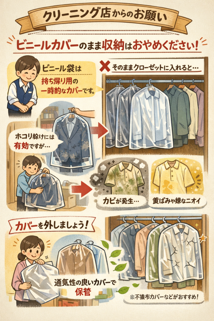 仕上がった衣類にかかっているビニール袋は、あくまで「お渡しまでの一時的な保護」を目的としたものです。店舗からご自宅までの移動中にホコリや汚れが付着するのを防ぐ役割であり、長期保管を想定して作られていません。ビニールは通気性がほとんどないため、そのままクローゼットに収めると、目に見えない湿気が衣類内部にこもりやすくなります。すると、カビの発生、黄ばみ、嫌な臭いの原因となり、せっかくクリーニングで整えた状態を損なってしまいます。また、ビニール袋は静電気を帯びやすく、空気中のホコリを引き寄せたり、生地に余計な負担をかけたりすることもあります。衣類を良い状態で長く着ていただくためにも、ご帰宅後はビニール袋を外し、通気性の良い不織布カバーなどで保管していただくことを強くおすすめしています。