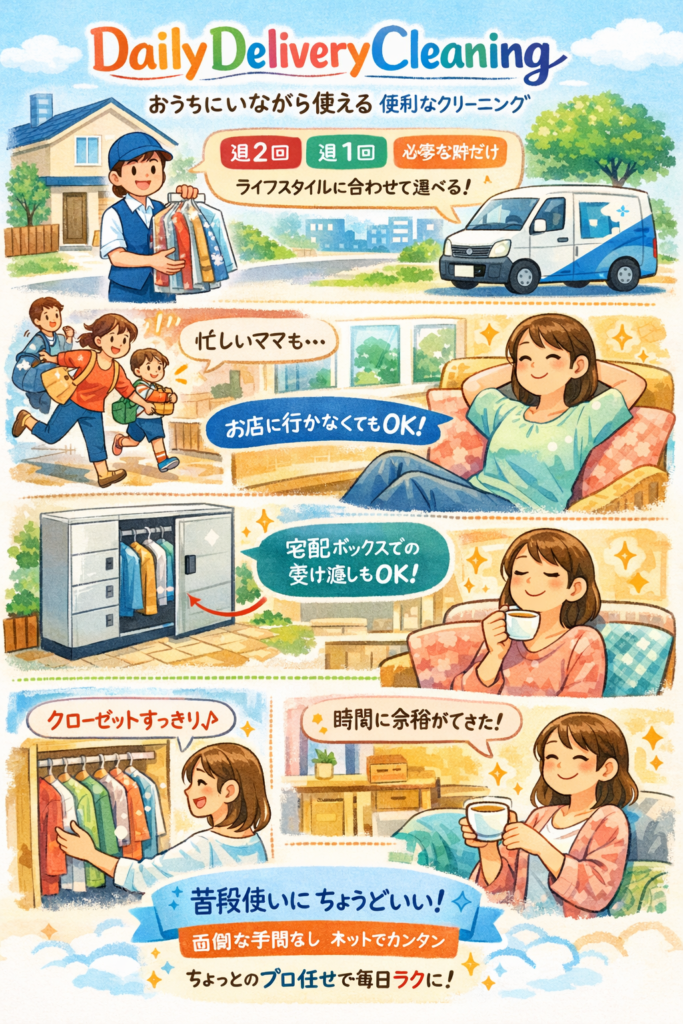 例えば、仕事と家事を両立している30代のお母さんを想像してみると、朝は子どもの準備と自分の支度で大忙し、帰りはスーパーに寄って夕食の準備。クリーニングに出したい服はあるけれど、「お店に行く時間がない…」と後回しになりがちです。そんなとき、家にいるだけで預けられて、きれいになった服が戻ってくるのがDailyDeliveryCleaningです。「気づいたらクローゼットがすっきりしていた」という感じで、生活が少し楽になりますよ。